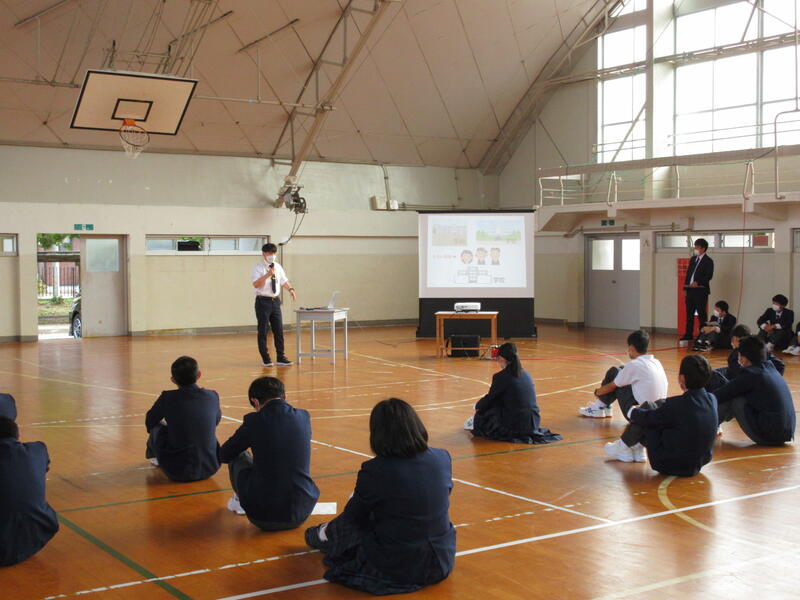 くぼた校集会が行われ、分校長先生の話、保健目標、生活目標、生徒会からの話がありました。最後に校歌斉唱です。