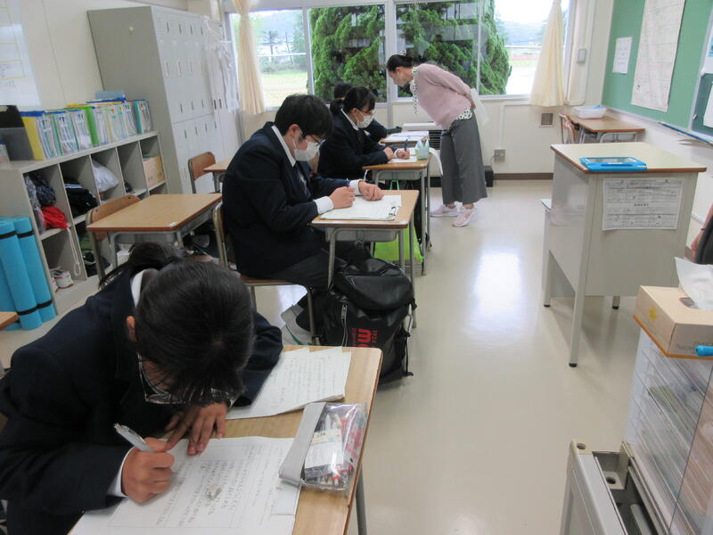 (1年生)自己紹介では、英語で好きな物を伝えると、ライアン先生がパソコンで検索して、画像を見せました。生徒は、伝わった喜びと好きな物の画像を見た嬉しさから笑顔で活動していました。次に、いわきの特産物を日本語で紹介して、英語を教えてもらいました。「長ネギ」は“green onion”(グリーンオニオン)だと分かると、「緑の玉ネギなんだ」と感心していました。