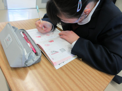 1校時目の準備の後、読書や漢字検定に向けての自習、好きな四コマ漫画を描くなどしています。保健委員会の役員の生徒は、1年間の計画について話し合いをしました。